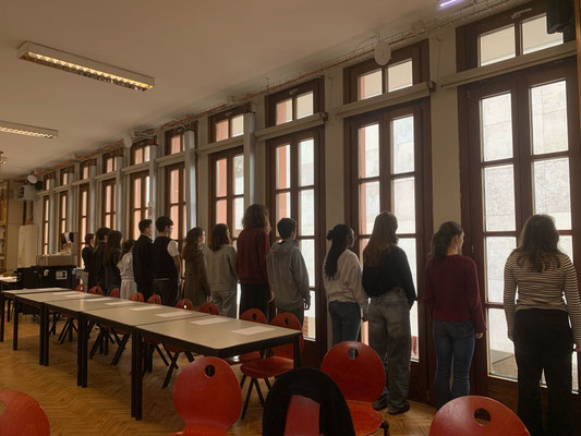 Des binômes, constitués de manière aléatoire, communiquent en silence et par écrit.