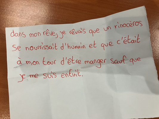 En 2015, des détenus ont été invités à écrire les rêves qu'ils avaient faits pendant la nuit. L'un de ces rêves a été répété à l'oreille par plusieurs volontaires dans un musée. Le dernier participant a consigné à l'écrit ce qu'il avait entendu (Centre Pompidou, 2019)